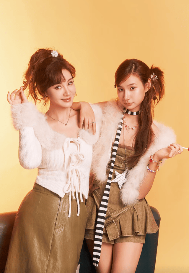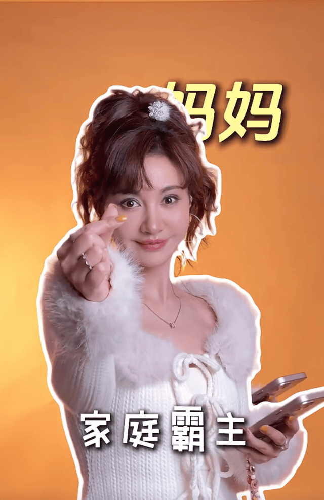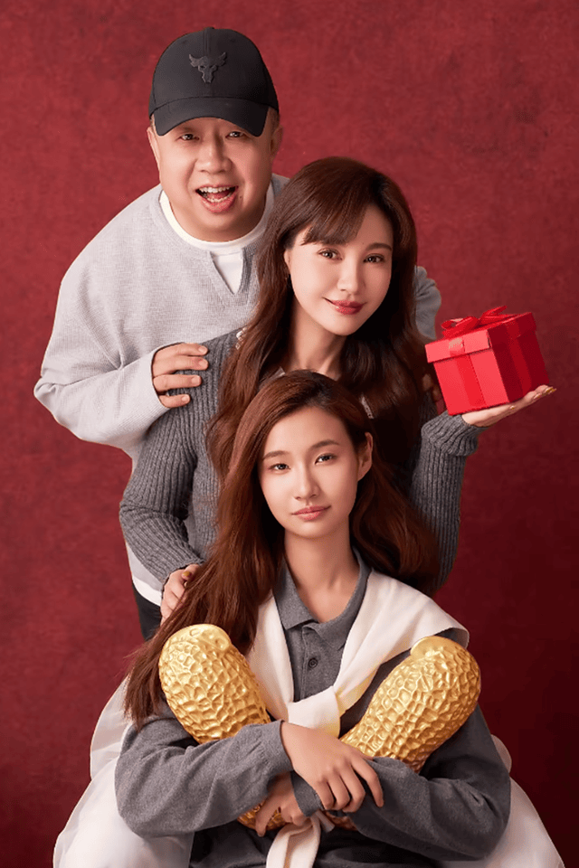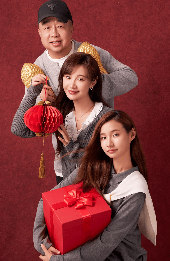 晒出的照片中,杨雪留着棕色长发,身穿深灰色针织衫,右手托举着一个系有红色蝴蝶结的红色礼盒,面带微笑,眼神柔和,姿态优雅。女儿有有站在她身前,有有和妈妈留着同样的棕色长发,身穿灰色Polo衫,外搭白色披肩,双手环抱两个金色的花生造型摆件,表情平静,目光直视镜头,整体造型简洁大方。