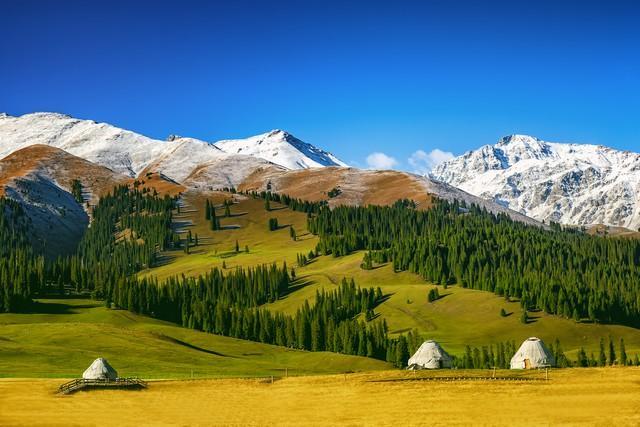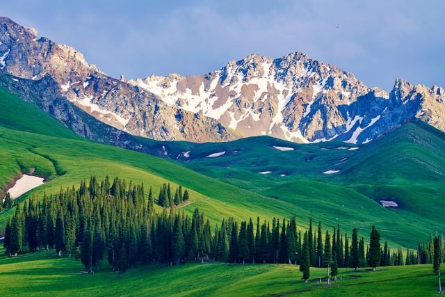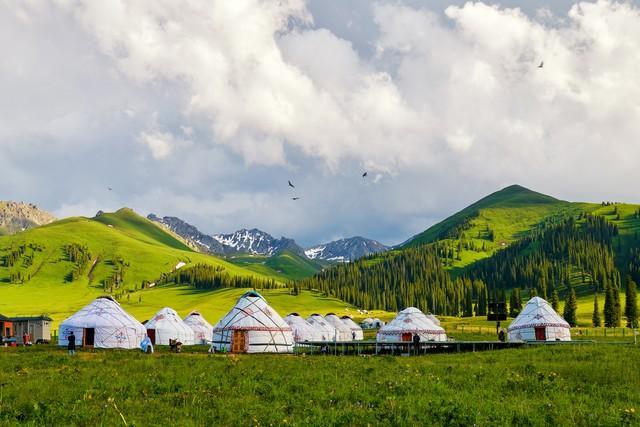 那拉提在蒙古语里是“最先见到太阳的地方”。这里的草原不只是一望无际的平地,而是山地草原,草坡起伏,线条柔和。远处的雪山、中间的云杉林、近处的草甸,三个层次叠在一起,画面特别丰富。每年六七月,草原上的野花开了,金莲花、党参花、野罂粟,五颜六色。哈萨克族的毡房散落在草坡上,炊烟升起的时候,是一幅安静的画面。骑马走一段,或者就坐在草地上发呆,都是不错的选择。