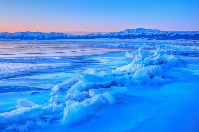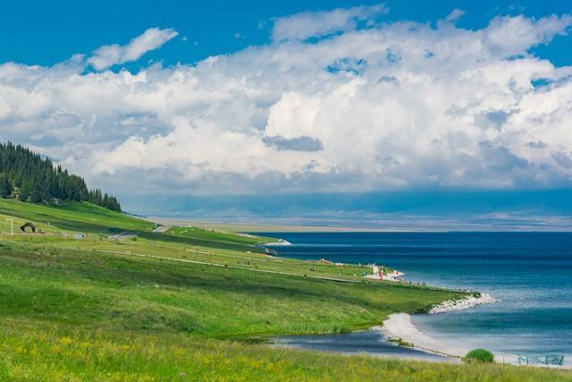 赛里木湖是大西洋暖湿气流最后眷顾的地方,所以有人叫它“大西洋最后一滴眼泪”。湖水蓝得不像真的,透明度极高,站在岸边能看见湖底的石头。四周是雪山和草原,每年六七月,湖边开满了野花,金莲花、紫菀、鸢尾,一层一层铺到水边。冬天湖面会结冰,冰层里冻着气泡,形成冰泡湖奇观,是摄影师追着拍的画面。绕着湖走一圈,每个角度的蓝色都不一样。