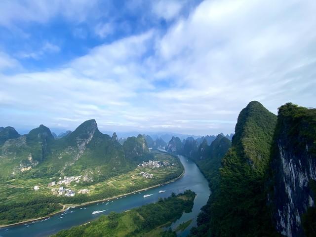 “桂林山水甲天下”是写在课本里的话,从小听到大。真正到了桂林才知道,这句话没有夸张。漓江从桂林到阳朔这一段,两岸的石峰一个接一个,倒映在清澈的江水里,船行江上,像在一幅长卷里慢慢移动。兴坪段的黄布倒影是二十元人民币背面的图案,可以拿着纸币比对着拍张照。阳朔的遇龙河比漓江更安静,坐竹筏漂流,两岸是田园和村庄,少了几分名气,多了几分惬意。