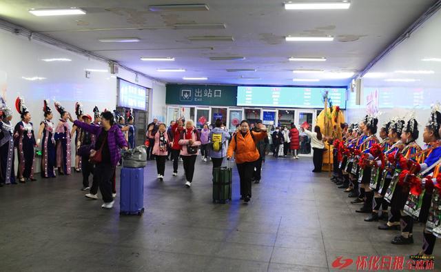 3月15日,一批外地游客走出怀化火车站出站口时,怀化市侗韵琵琶芦笙队载歌载舞举行欢迎仪式。近年,随看怀化旅游业的发展,大批国内及海外游客前来观光。